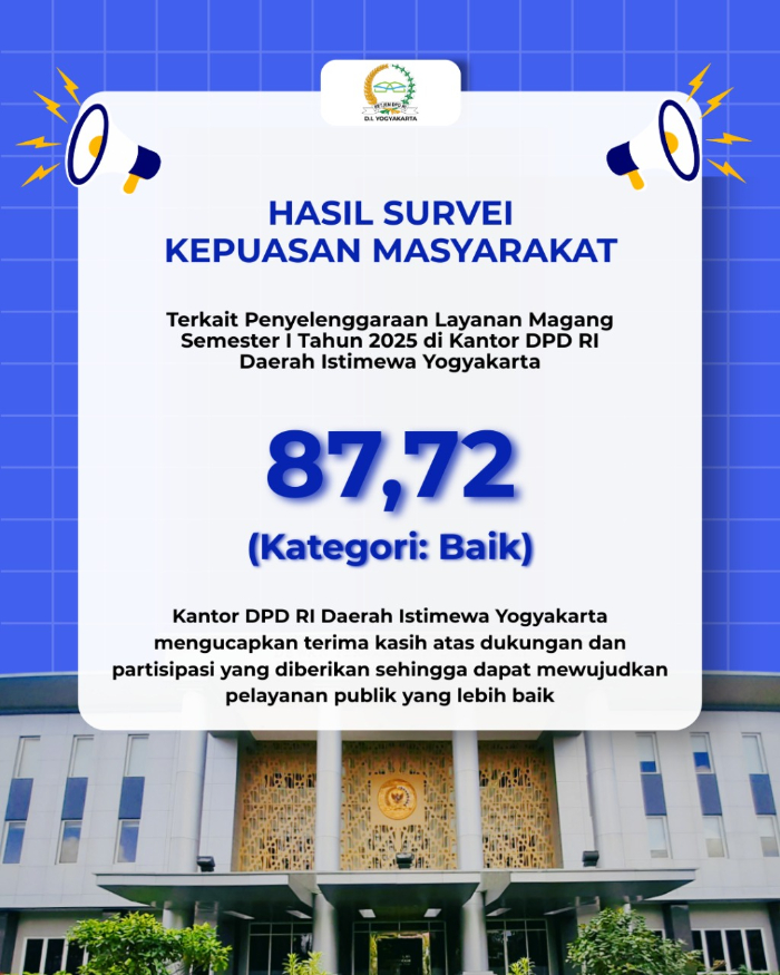 POLITITUDE – Sekretariat Kantor Dewan Perwakilan Daerah Republik Indonesia Daerah Istimewa Yogyakarta berhasil meraih predikat baik dalam survei kepuasan masyarakat atau SKM. Predikat ini berhasil diraih berkat layanan penyelengaraan magang tahun 2025, DPD RI DIY meraih nilai sebesar 87,72.